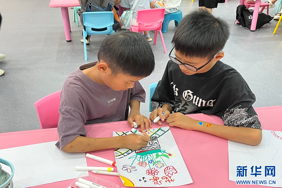 8月6日,在唐河县新时代文明实践中心,两个小朋友在合作绘画。